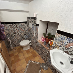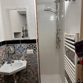 La Stanza Estate è una matrimoniale situata al primo piano. La camera è intima e riservata. Il pavimento della camera è in legno, mentre le pareti sono bianche. Il design della casa è pulito e minimalista, mentre il bagno è ricco di dettagli. Propionel bagno c'è una finestrella che affaccia sul tetto, da cui è possibile vedere tutto il paese in miniatura.
